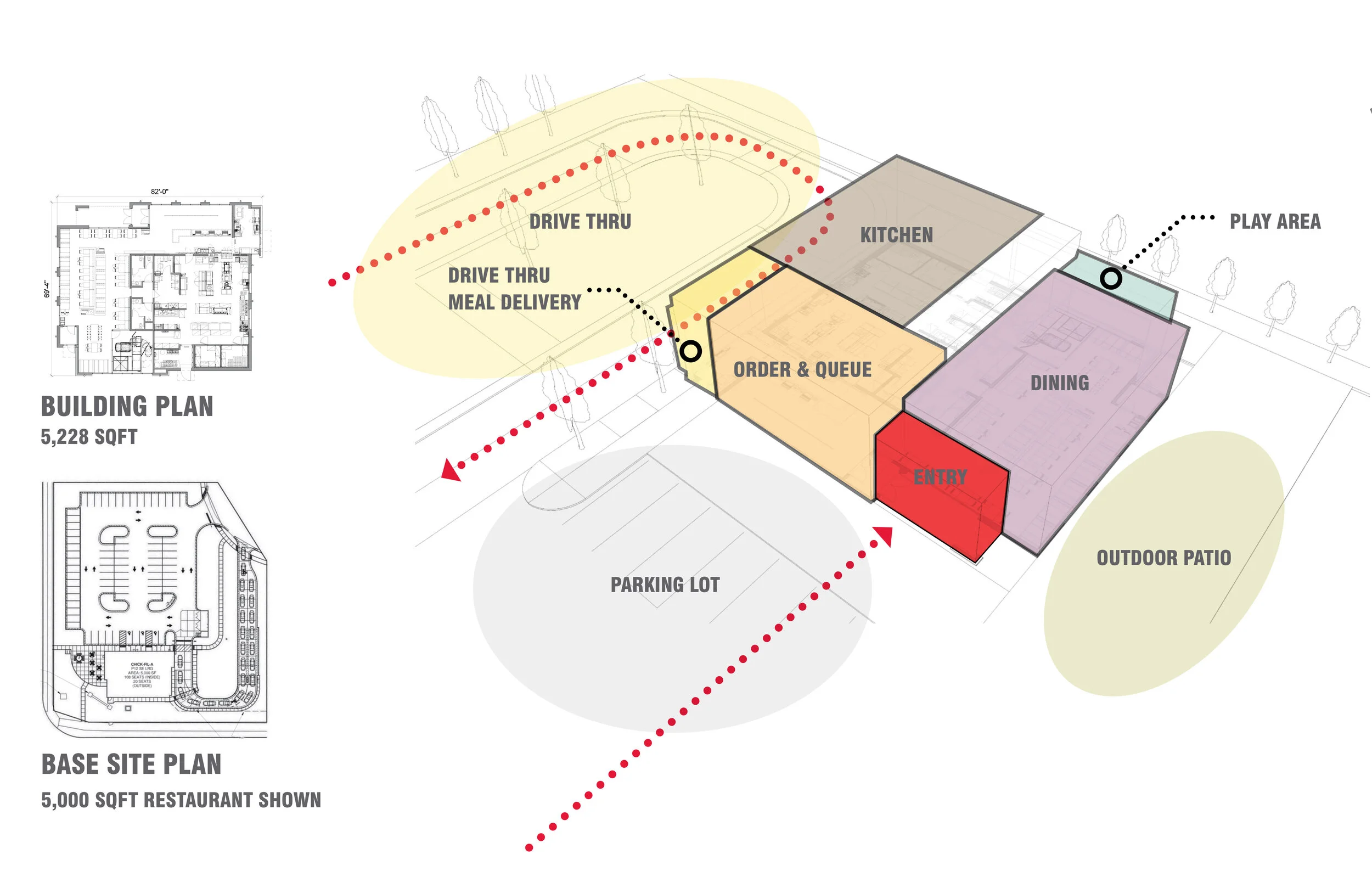 Using existing programming, we designed three distinctive concepts that consider how customers approach and view the building from different vantage points to create a Chick-fil-A experience from every angle.
